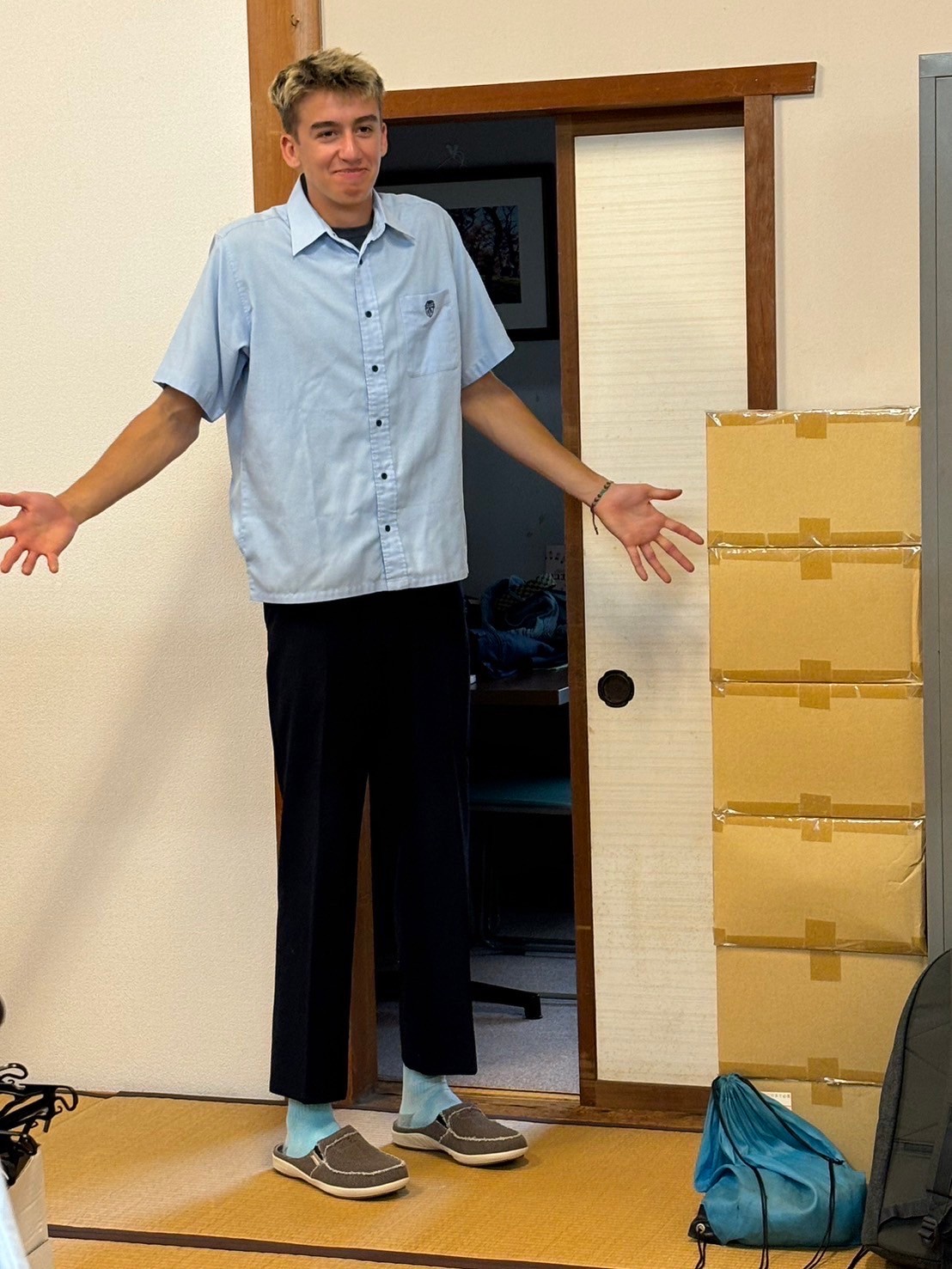 We first went to a guest room and introduced ourselves to each other. I was amazed that they introduced themselves in Japanese fluently. After our self-introduction, we went to the nurse’s office at school to try on our school uniform. They seemed really excited to wear it. Since Charles, one of the American students, is about 6’1 tall, the pants that we had were small and they both laughed at it. After that, we went to classrooms. As it was the first time for most of the students at SHS to see someone with blue eyes and blond hair in person, they all leaned forward to see them closely. After Charles and Chaz introduced themselves, the students applauded their fluent Japanese. We also went to the teachers’ office and the Judo hall. They seemed interested in the teachers’ office and said, “We don’t have this kind of room where teachers work altogether. In America, each teacher has their own room and students go to a classroom based on a subject they study, but it’s the opposite here, and it’s interesting!” As it was their first time to visit a Japanese high school, they seemed interested and excited about everything they saw.