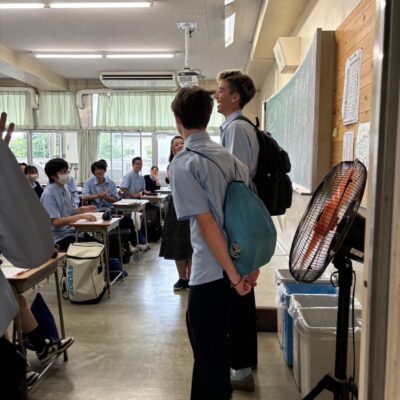 桜丘を案内した際には、2年生の授業にお邪魔させてもらい、簡単な自己紹介を行いました。目の青い金髪の西洋人を見て生徒は大はしゃぎ。その後も職員室や柔道場を案内しました。「アメリカの高校ではこのような職員室がないので驚きました」と初めての日本の高校に目を輝かせていました。