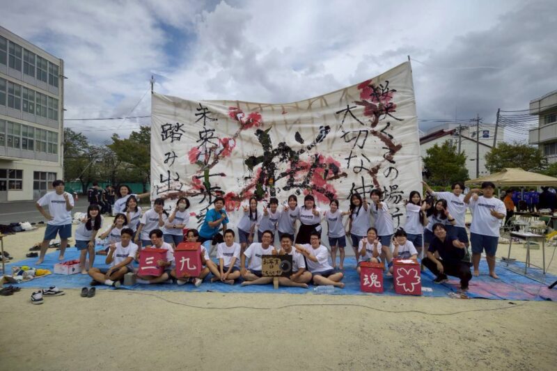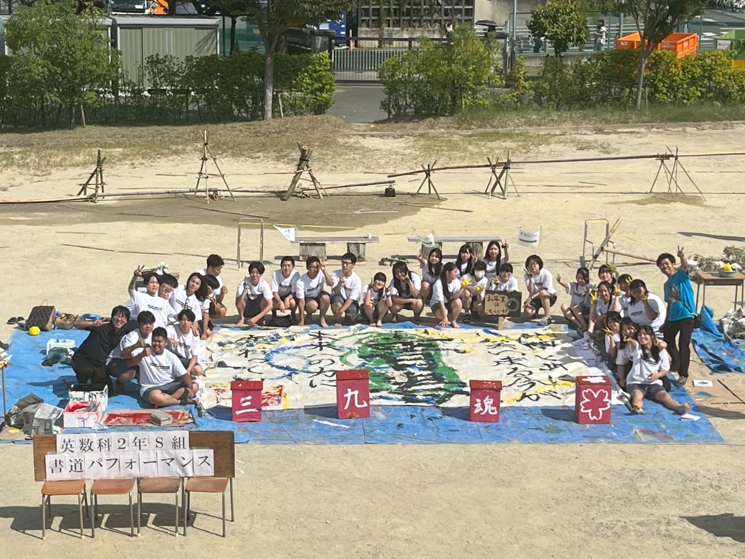 2年S組は、珍しいパフォーマンスを行いました。みんなで一つの紙に文字は柄を書いて行う書道パフォーマンス。リハーサルでは、紙が墨やペンキに耐えることが出来ずバラバラになってしまいました。不安が残る本番1回目。みんな一生懸命文字を書き、いざお披露目!紙は大きく掲げられ見事成功しました。「桜」という何とも味のある一枚が完成し、S組は大歓声を受けました。続く二回目は「青春」という文字を作ろうとしましたが、風が強く立てさせるのが困難のため、倒したままの状態で完成となりました。練習回数が少ない中、よく頑張ったと思います。