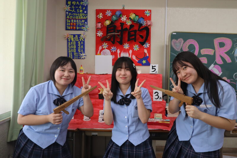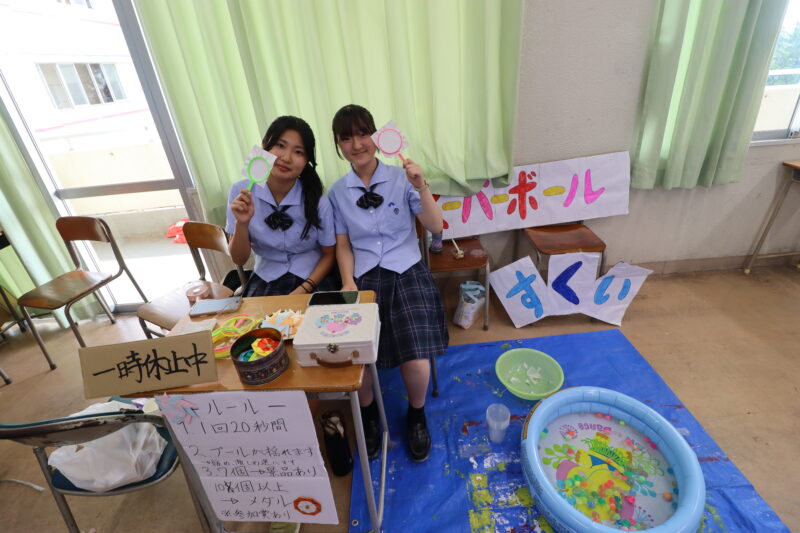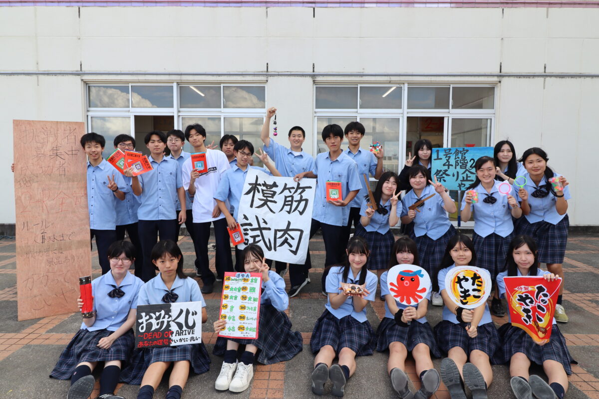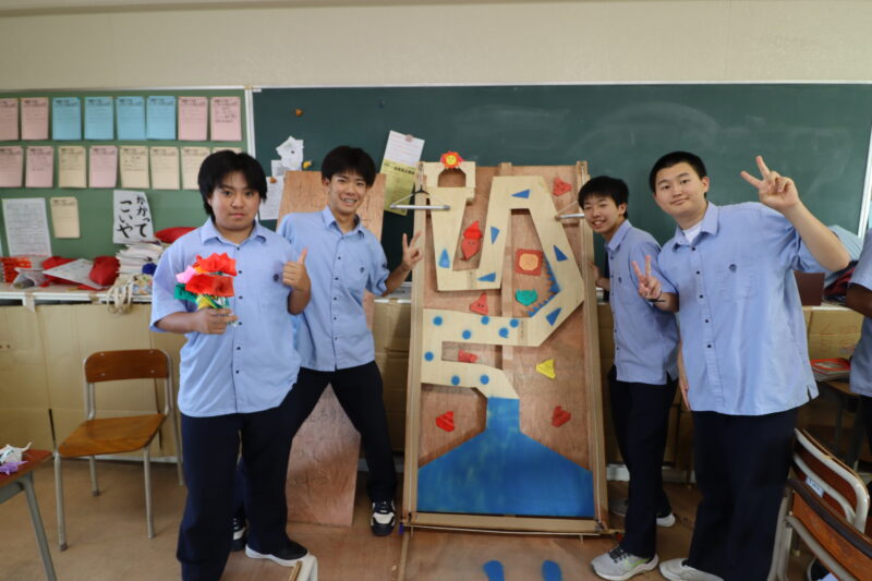 2年R組は縁日をモチーフとしたものを作り上げました。中に入るとまさに縁日、たこ焼きの屋台があり、隣には射的やスーパーボールすくいがプレイできました。小さいお子さんも楽しんでいる姿が目に映りました。私はおみくじとボール運びを体験しました。おみくじには、生徒が考えた内容と、英数科・文理の先生達からのメッセージが書かれていました。自分は大凶を引いて、まさかの自分が書いたメッセージのおみくじを当てるという奇跡が起こりました。店番の生徒も笑っていましたが、とても楽しそうでした。もう一つのゲーム、ボール運びでは、英数科ならではの計算と考え込まれたシステムでした。難易度も高く、話によると10人もクリアできなかったとか。そんな楽しい縁日ですが、生徒たちの笑顔が絶えない場所になっていました。