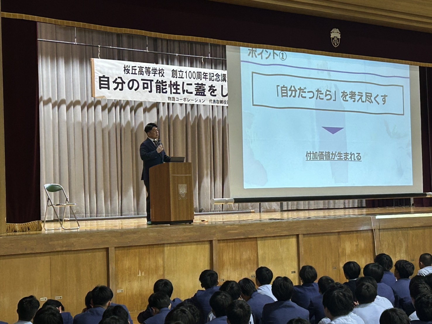 今回の講演会には本校卒業生(2004年度卒)で、現在物語コーポレーション代表取締役社長