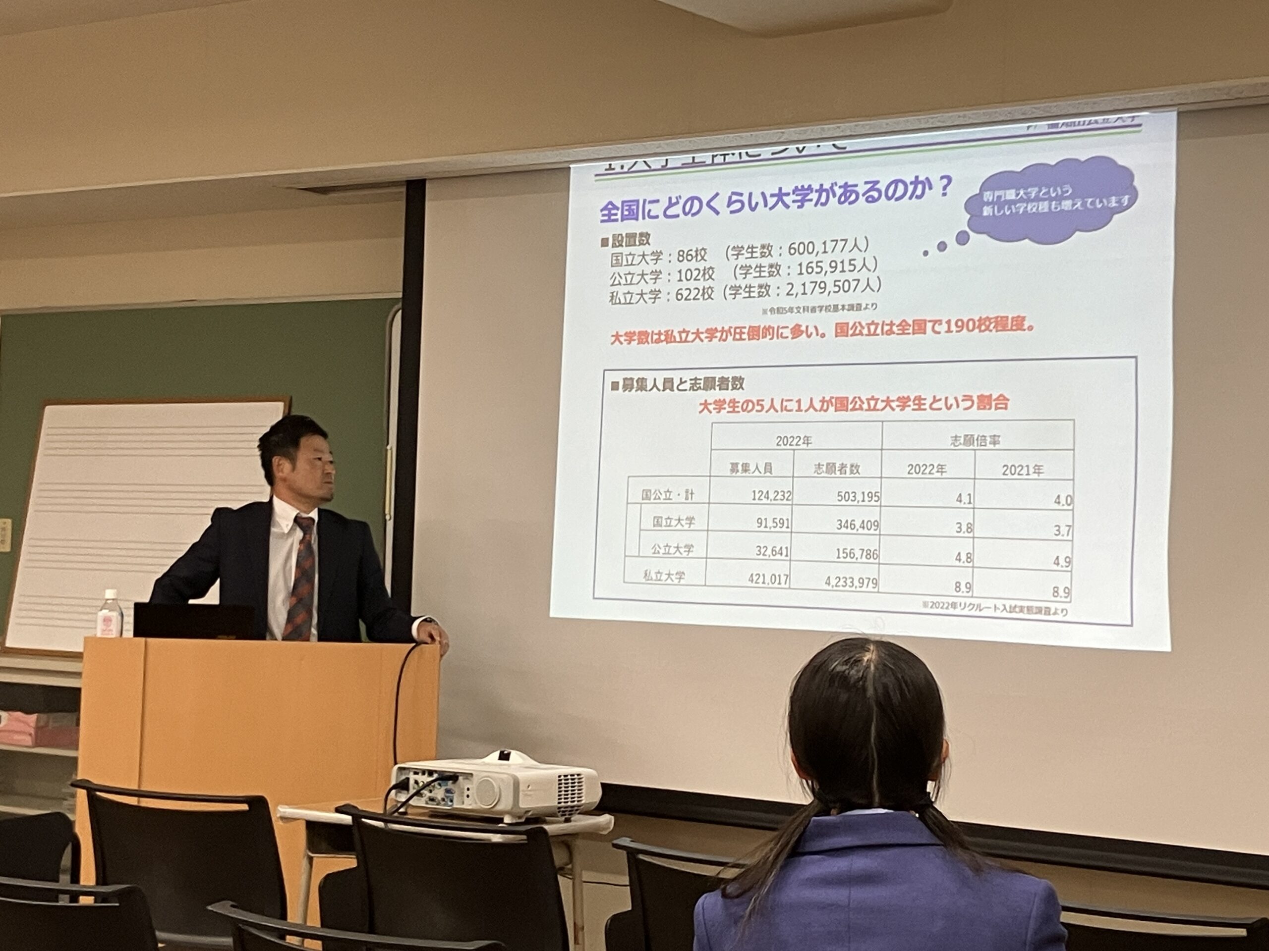 当日は大学の入試広報課の方をお招きし、学部・学科の特色や地域連携を活かした実践的な学びについてお話をいただきました。特に「地域課題を大学教育の中で解決していく」という取り組みや、「地方から社会を動かす人材を育てる」というメッセージは、生徒たちにとって印象深いものでした。
