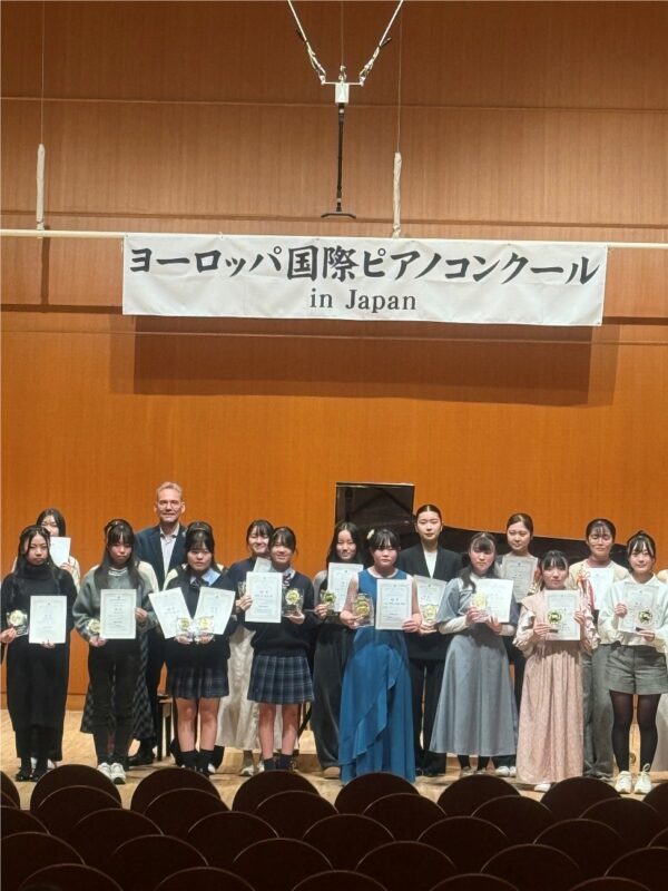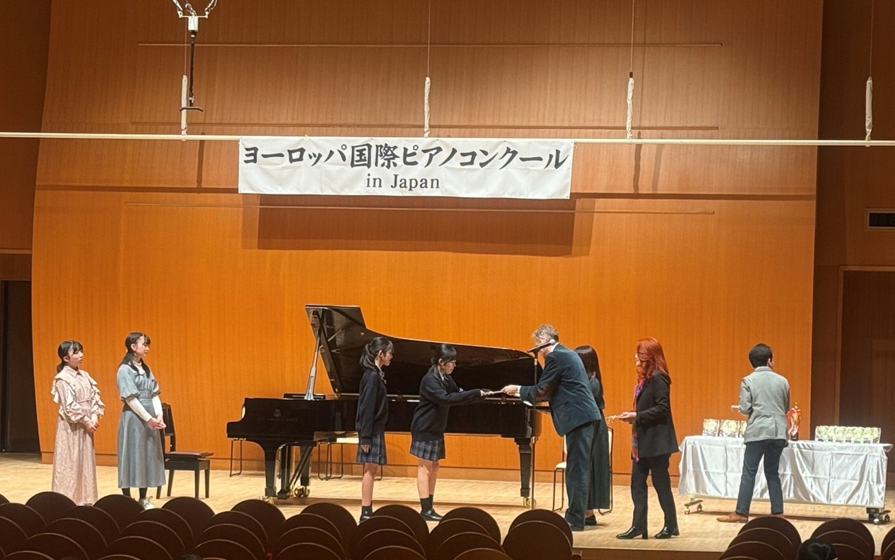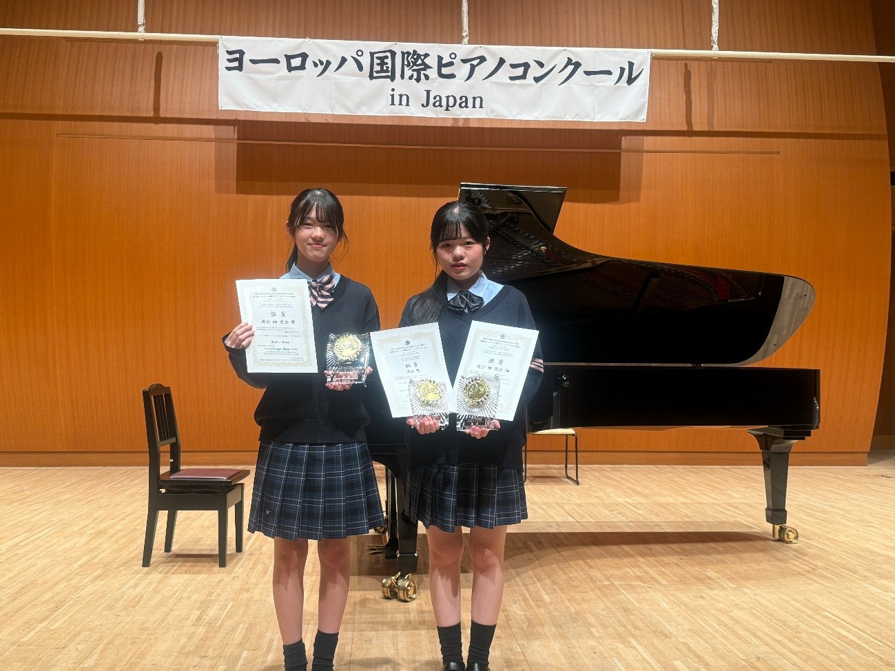『ヨーロッパピアノ国際コンクールin Japan』において3年1組 音楽科の渡会 雅さんがピアノソロ部門銅賞受賞。 連弾部門において渡会 雅さんと妹の渡会 紬さん(桜丘中学校3年生)が銀賞受賞。雅さんと紬さんの授賞式の写真をご紹介します。後日、姉妹連弾の動画を冒頭のみ、桜丘Instagramの方でご紹介します。 (野畑さおり)