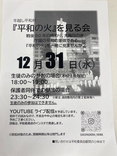 12月31日(水)に「『平和の火』を見る会」を実施します。今年も残りわずか…。戦後80年の節目の年が終わろうとしています。今年度の本校平和委員会は、「戦争・平和を夏の季語で終わらせない」を目標に掲げました。この言葉の通り、年間を通して様々な活動を続けてきました。年末、最後の活動として、この企画を実施します。本学園の『平和の火』を見ながら、戦後80年を終える瞬間を生徒たちと共有したいと考えました。そこで、本校生徒と保護者を対象に『平和の火」』を見る会を開催します。詳細は、チラシに掲載してある通りです。掲載してある時間帯、『平和の火』を観覧することができます。関係者のみの観覧になりますのでご理解ください。YOUTUBE配信の調整が整いましたら、インスタで状況をお知らせします‼