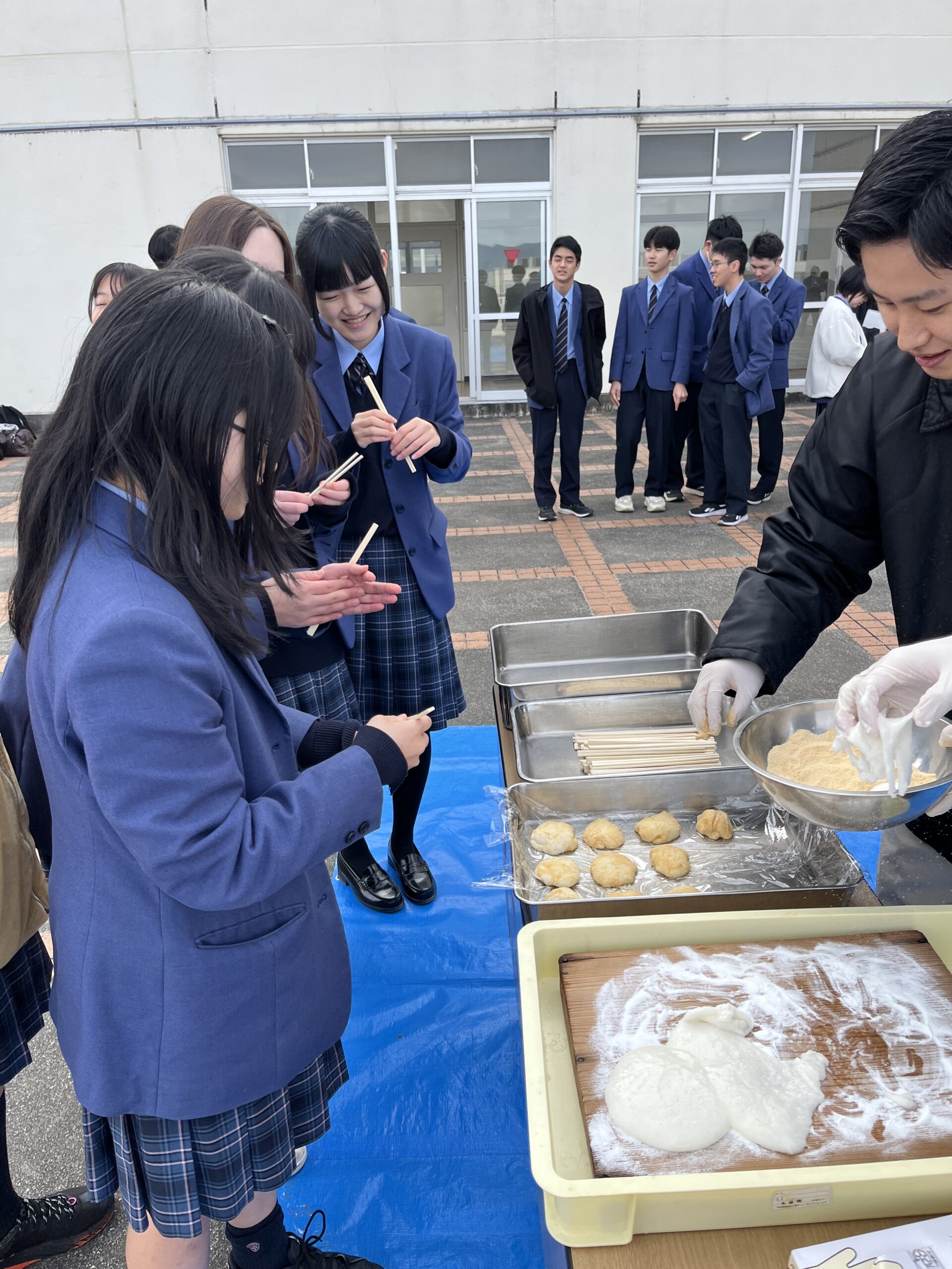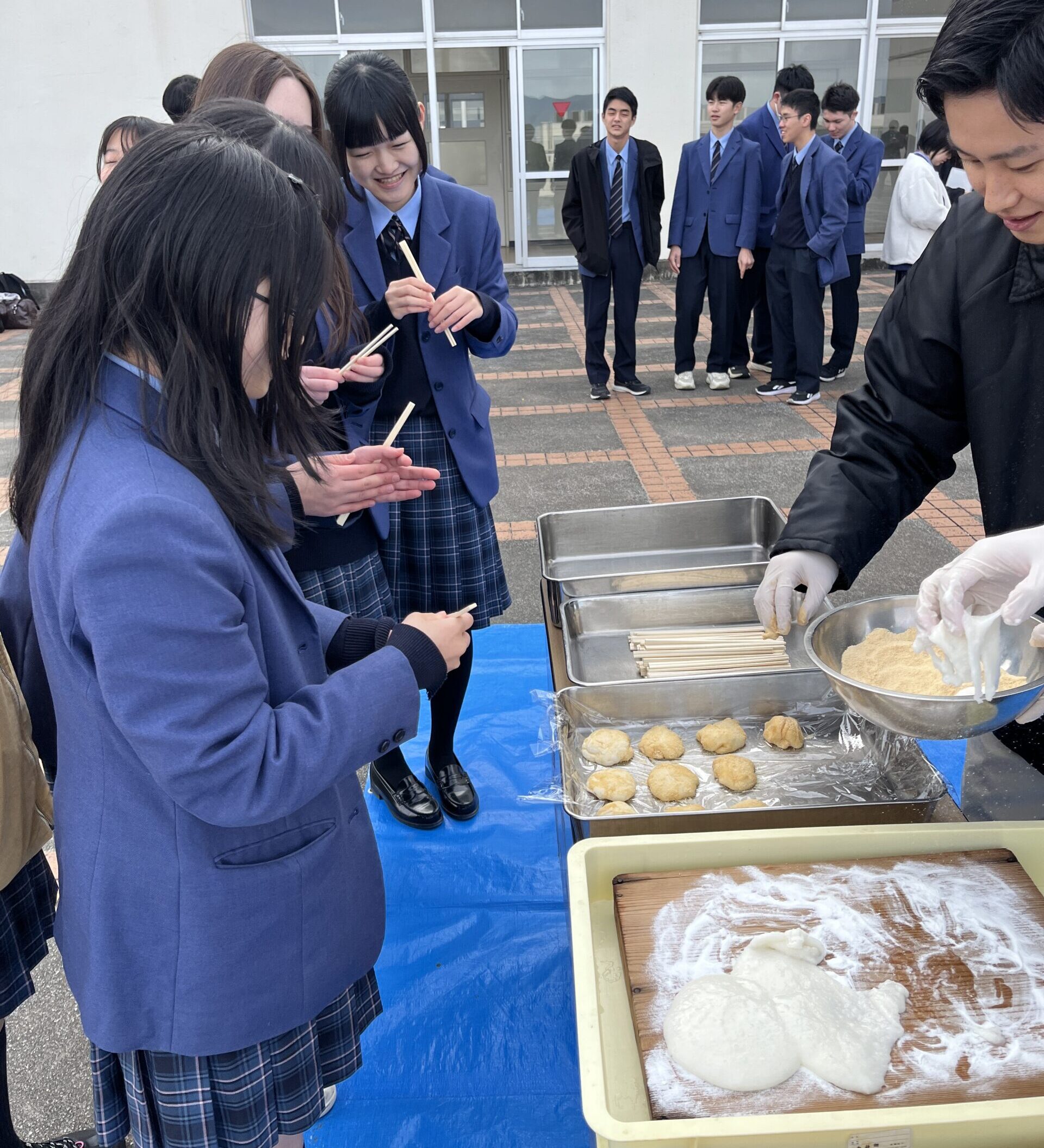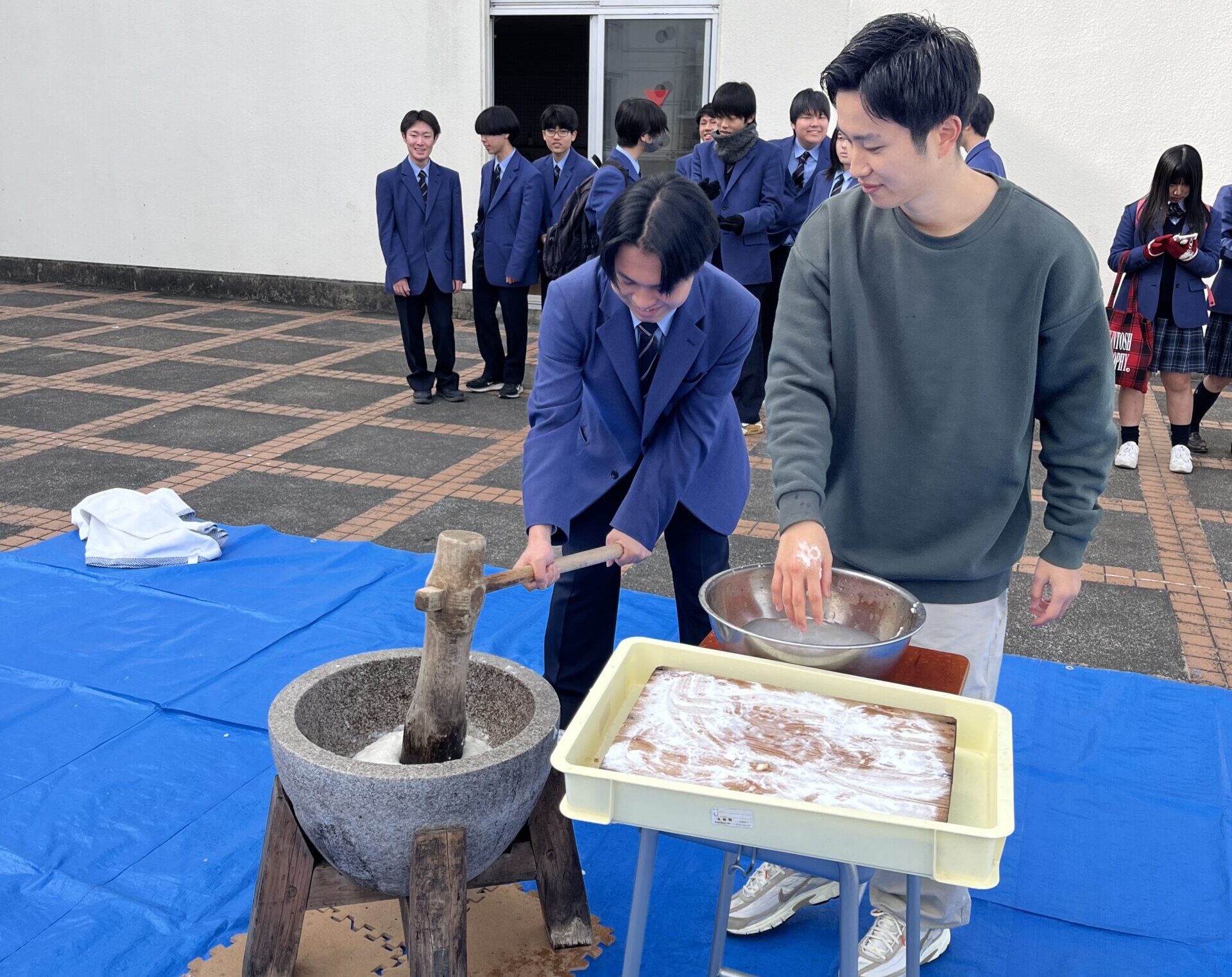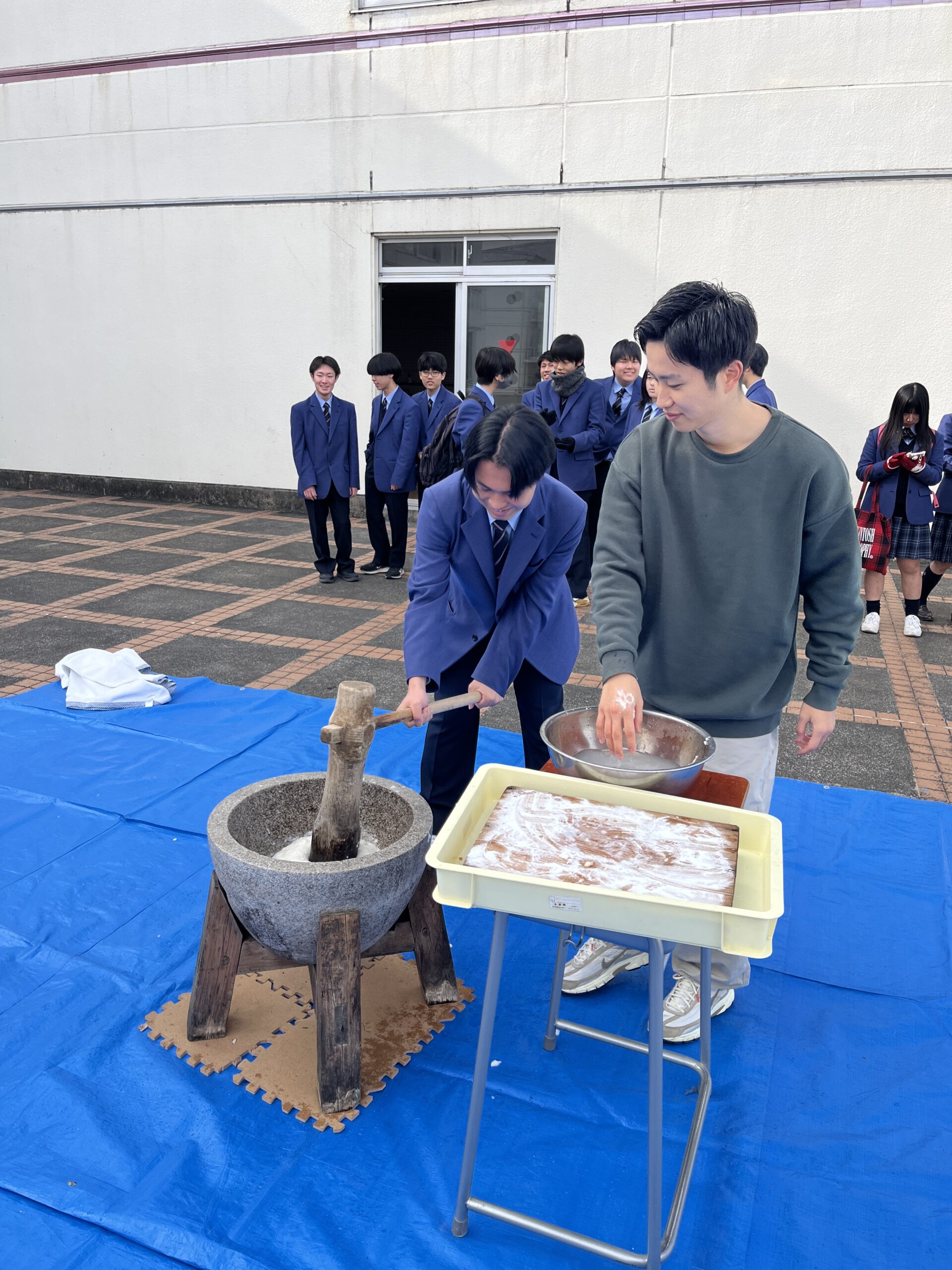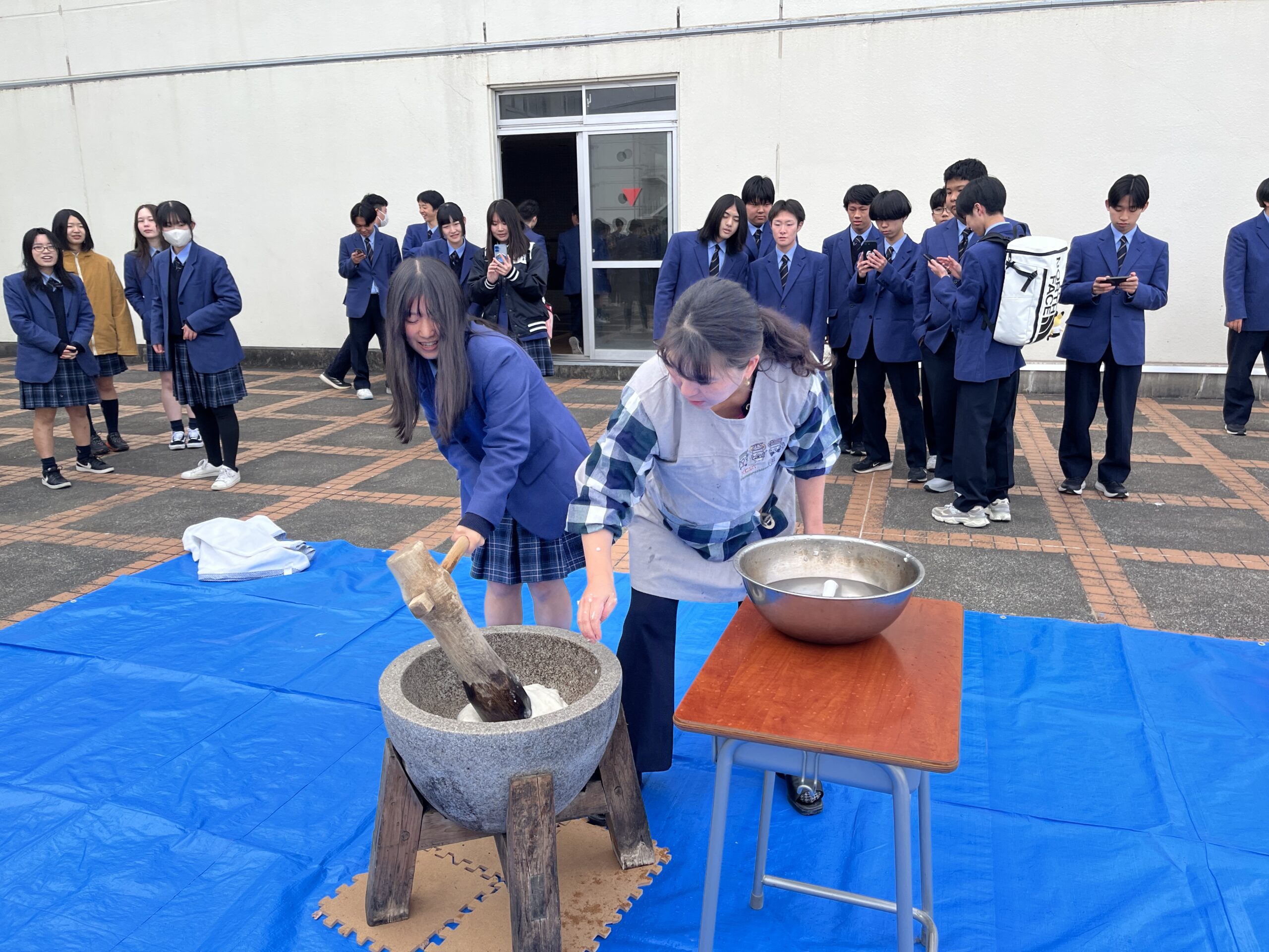 杵と臼を使った餅つきは、多くの生徒にとって初めての体験でした。
