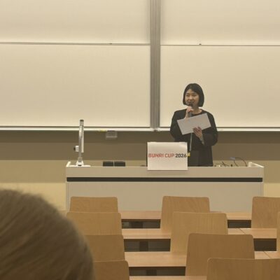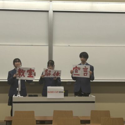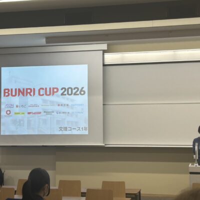 2月10日(火)、愛知大学豊橋校舎内にありますセンタービルにおいて、本校1学年文理コースの生徒97名、22チームによるBUNRI CUP 2026が開催されました。文理コース1学年では、教育の柱として「学習」と「探求」を掲げており、4月から企業探求プログラムに取り組んできました。様々な企業から出された課題に対して4名~7名のグループがそれぞれアイデアを出し合い、7分間のプレゼンテーションをするというもの。どの発表も既存の固定観念にとらわれない革新的なアイデアのものばかりで、感心させられる発表ばかりでした。それぞれの発表評価は①調査力②論理性③表現力④独創性⑤探求力の視点で採点されます。採点には「イオンリテール」、「パナソニックエナジー」、「教育と探求社」の方々からもご協力をいただき、それぞれのチームに対しての講評をいただきました。子どもたちにとって、これからの成長につながる大変意義のある行事となりました。(文責:田嶌)