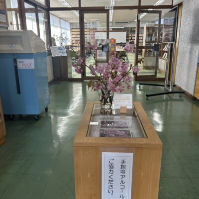 まず玄関を入ると、早速、静岡県から届いた河津桜が出迎えてくれました。その後、図書室に入ると、正面にはこの時期ならではのバレンタインコーナーが設置されていました。こちらは、現在インターンシップで本校を訪れている愛知大学生の三浦さんが手がけたものです。