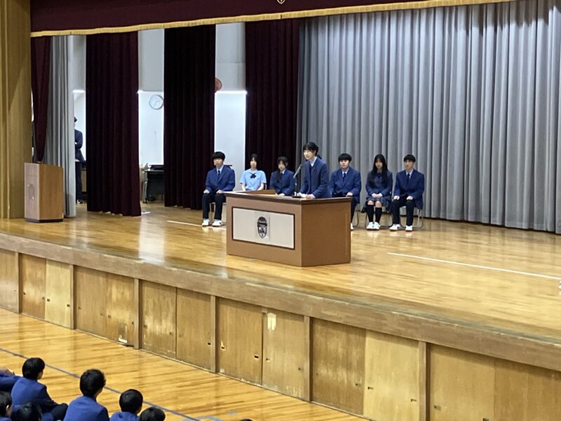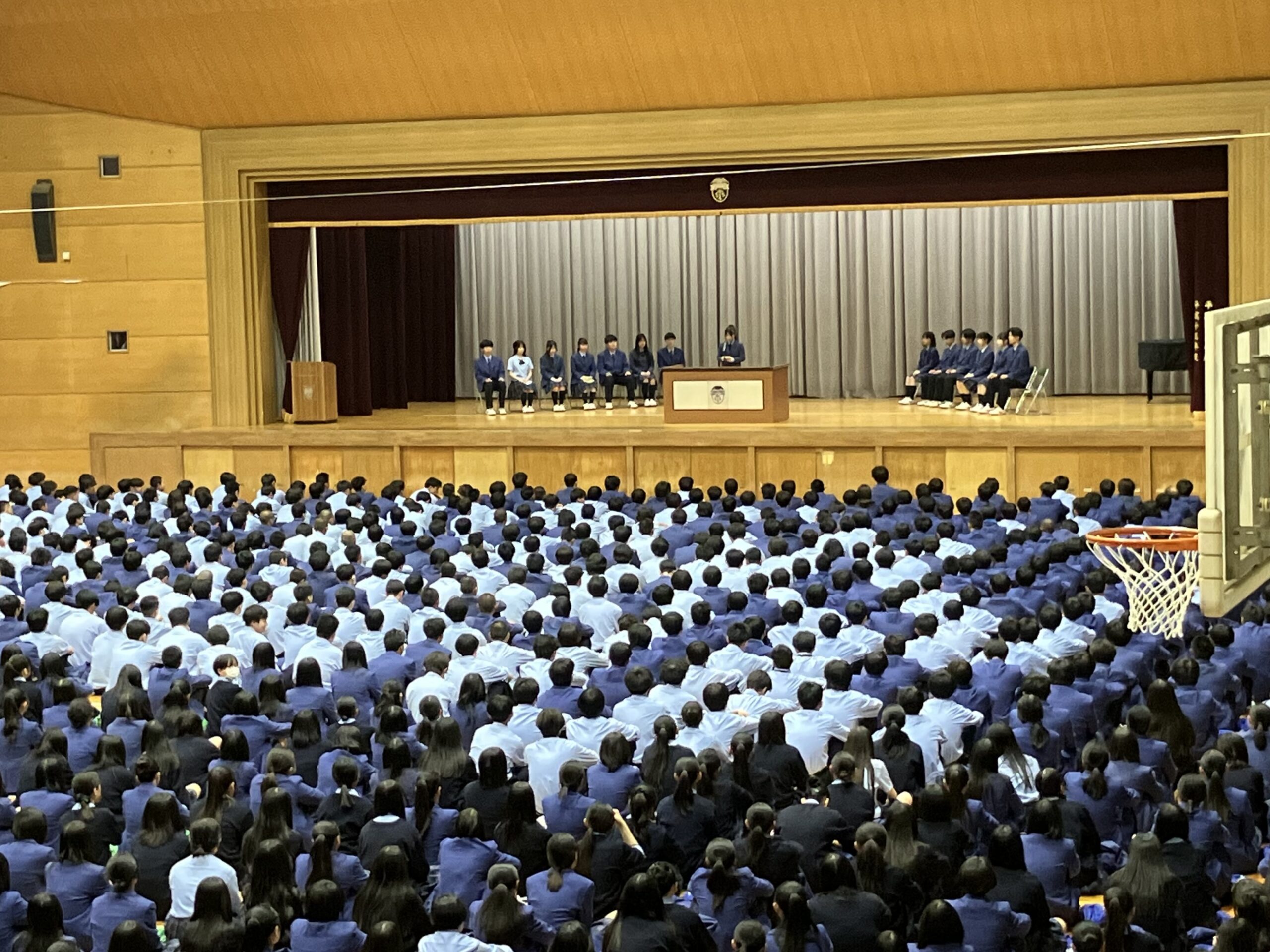 4月22日の6限に、前期生徒会役員選挙立会演説会が行われました。 今回は14名の生徒が立候補し、その中には入学したばかりの1年生の姿も見られました。どの演説からも「学校をよりよくしたい」「行事を盛り上げたい」という強い思いが伝わってきました。 特に決選投票の候補者たちは、公約や自身のアピールポイントを明確に示し、他の候補との差をしっかりと打ち出していました。熱のこもった演説に、聴いている生徒たちの表情も真剣そのものでした。