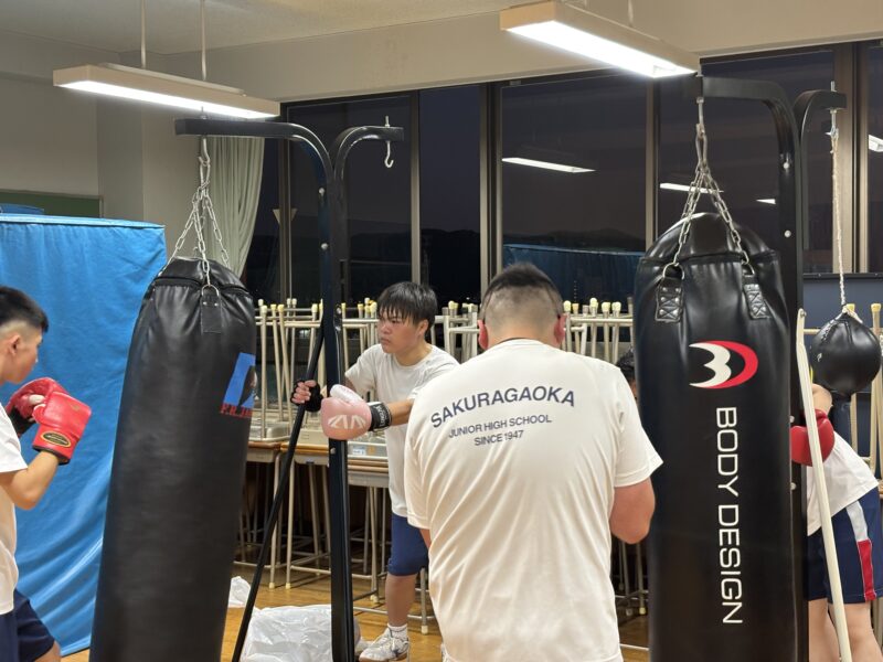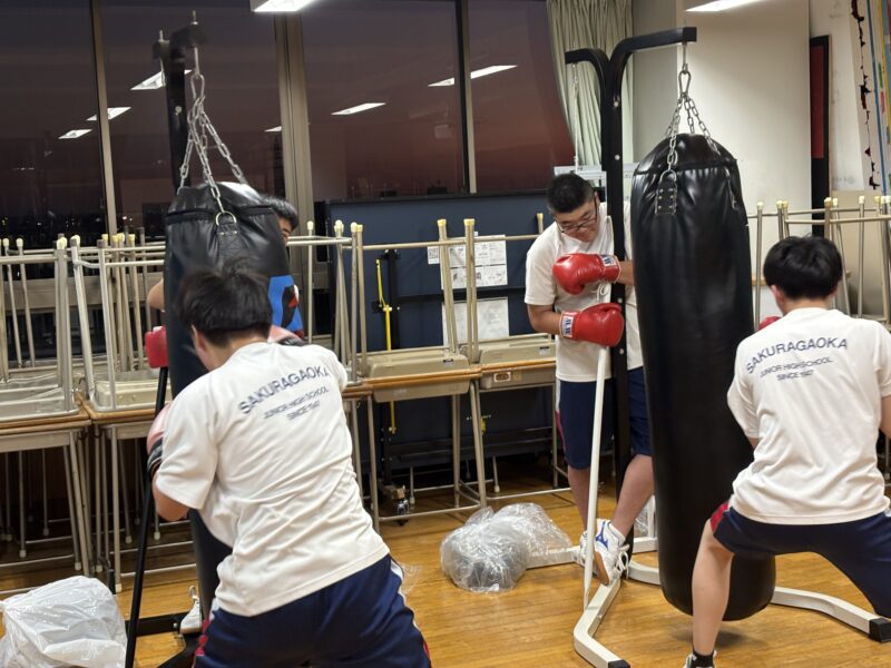 3年生と2年生の希望者が参加し、縄跳び、シャドーボクシング、サンドバックなど普段なかなか触れることのないボクシングに取り組みました。